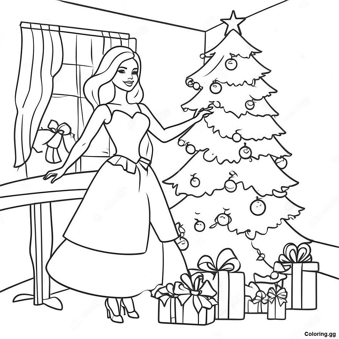 बार्बी एक क्रिसमस ट्री को सजाते हुए रंग भरने वाला पृष्ठ