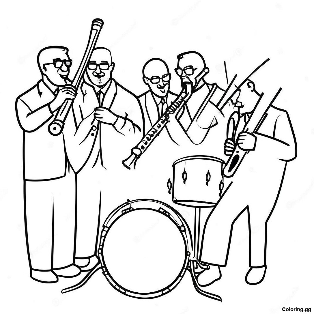 जैज़ बैंड प्रदर्शन रंग भरने वाला पृष्ठ का प्रिंट करने योग्य PDF डाउनलोड करें