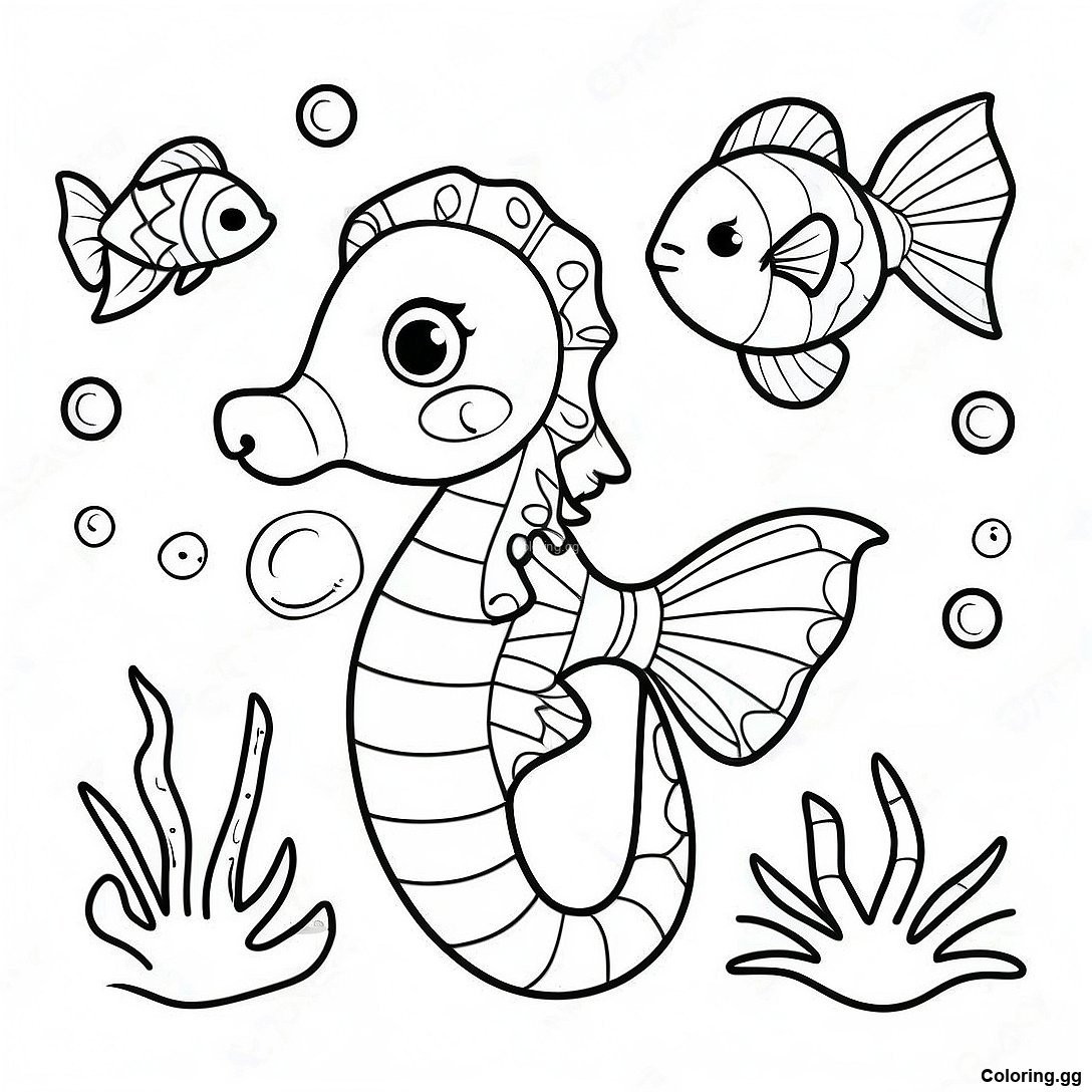 खुश समुद्री घोड़ा मछली के दोस्तों के साथ रंग भरने वाला