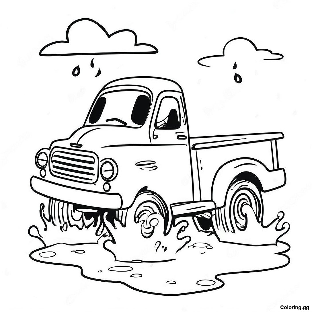 कीचड़ भरे पोखरों में ड्राइव करते हुए छोटा नीला ट्रक रंग भरने वाला पृष्ठ