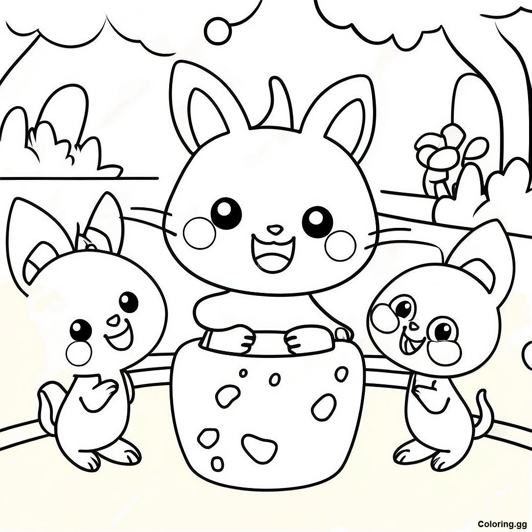 कुरोमी दोस्तों के साथ खेलती हुई रंग भरने वाला पृष्ठ का प्रिंट करने योग्य PDF डाउनलोड करें