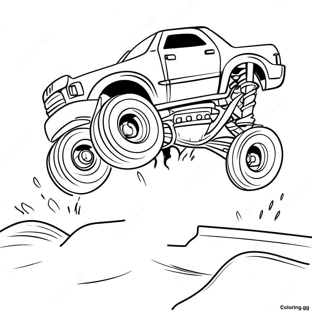 मॉन्स्टर ट्रक बाधाओं पर कूदते हुए रंग भरने वाला पृष्ठ का प्रिंट करने योग्य PDF डाउनलोड करें