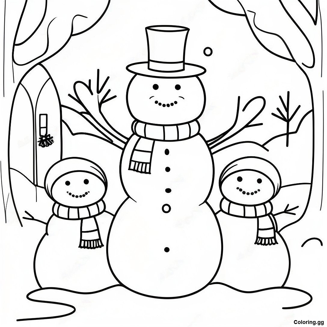 स्नोमैन परिवार विंटर वंडरलैंड रंग भरने वाला पृष्ठ