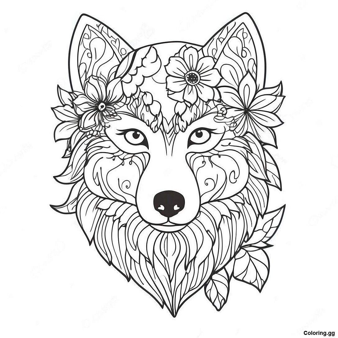 सुंदर भेड़िया फूलों के साथ रंग भरने वाला पृष्ठ का प्रिंट करने योग्य PDF डाउनलोड करें